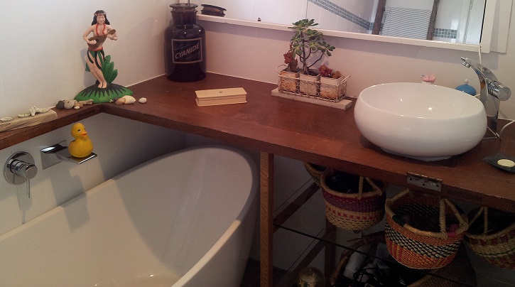 The centerpiece of this bathroom renovation was the use of an original art-deco solid timber door that was refashioned into a vanity and bathside shelf just wide enough to hold a bottle of wine and glass.